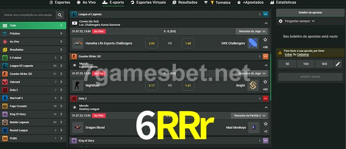 O 6RRr oferece uma grande seleção de opções de apostas em e-sports com probabilidades competitivas